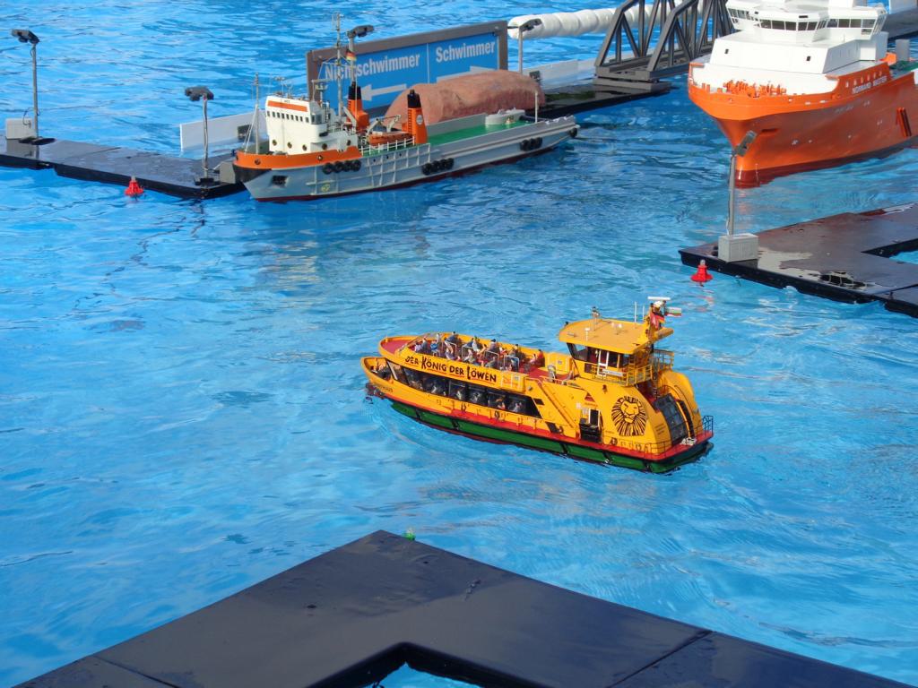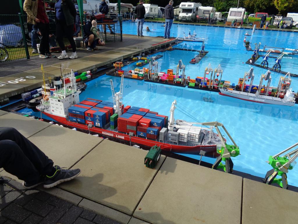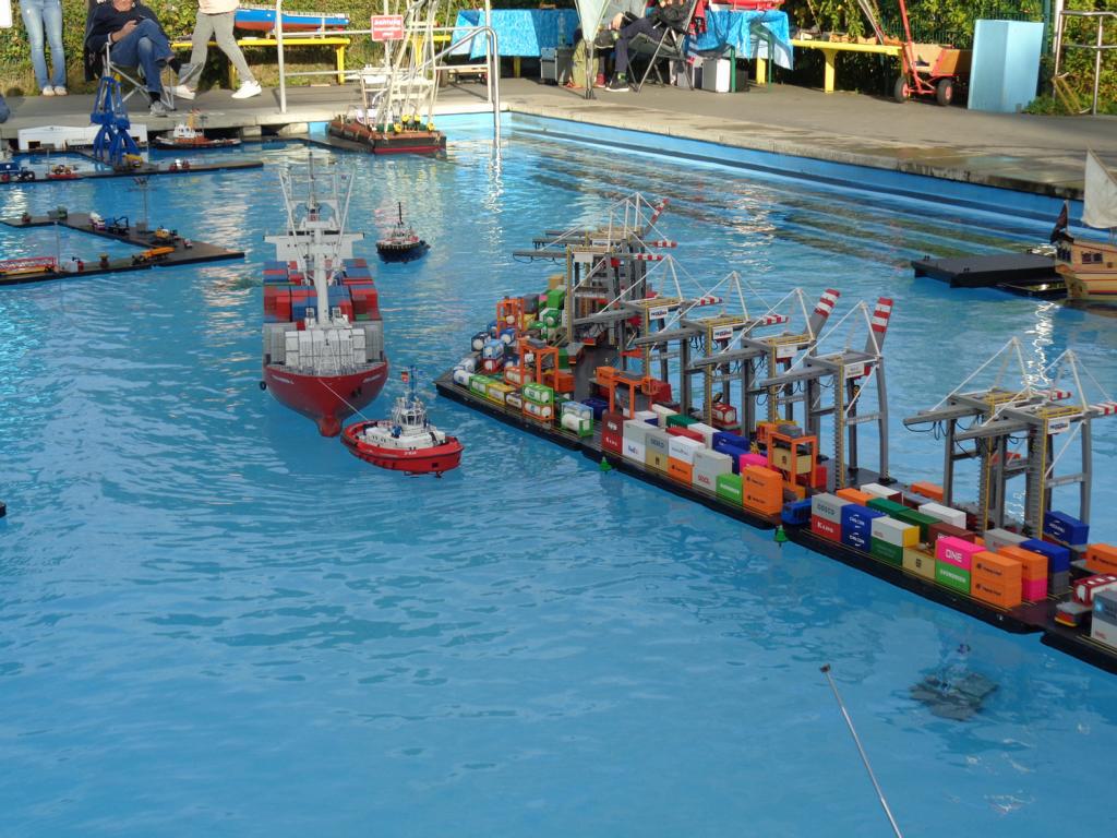 Inzwischen schien auch wieder die Sonne und so holten wir auch unsere beiden Springer Tugs aus dem Auto, und platzierten uns direkt am Wasserbecken. Im Nichtschwimmerbereich war eine sehr große Hafenanlage aufgebaut, so da man mit seinem Modell dort wunderbar hindurchfahren und anlegen konnte.