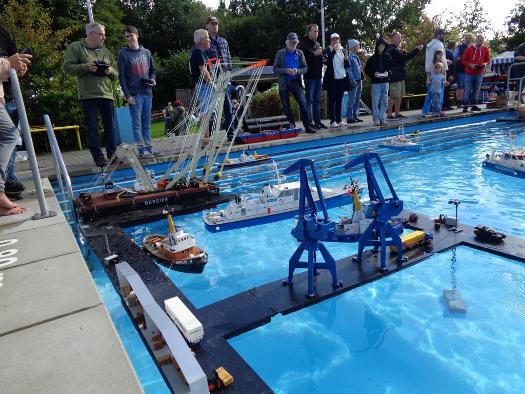 Am Wochenende 13./14.09.25 veranstalten die Modellbaukollegen von der IG- Störpiraten Neumünster erneut ihr Schaufahren in dem Freibad von Aukrug. Trotz unbeständigen Wetters, fuhren wir am Samstag gegen 14 Uhr dort hin. Gerade angekommen fing es heftig an zu regnen. Also erst einmal den Schauer abwarten und dann das Ganze erst einmal ohne Boote anschauen. Die Veranstaltung war sehr gut besucht über 100 Modellbauer von Krefeld, Lüneburg, Cuxhaven, Drochtersen, Flensburg usw. waren mit ihren Modellen gekommen um gemeinsam ein schönes Wochenende dort zu verbringen.