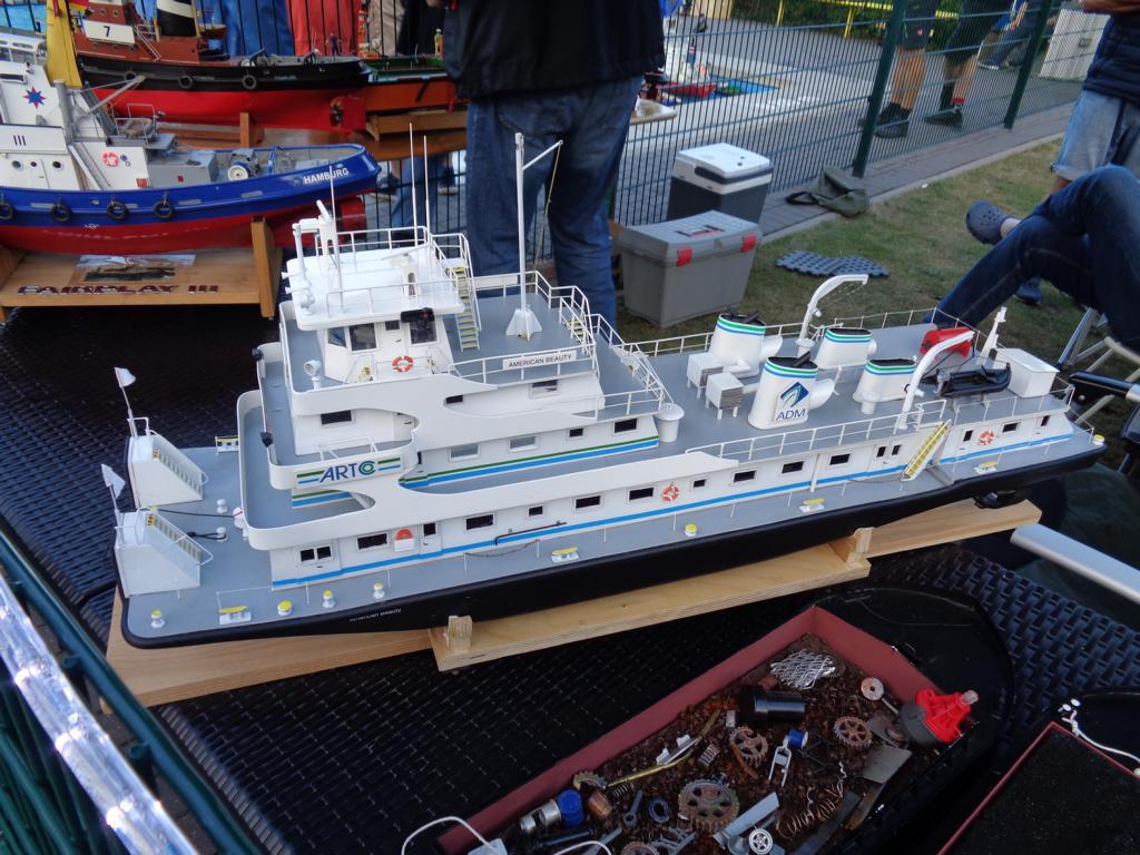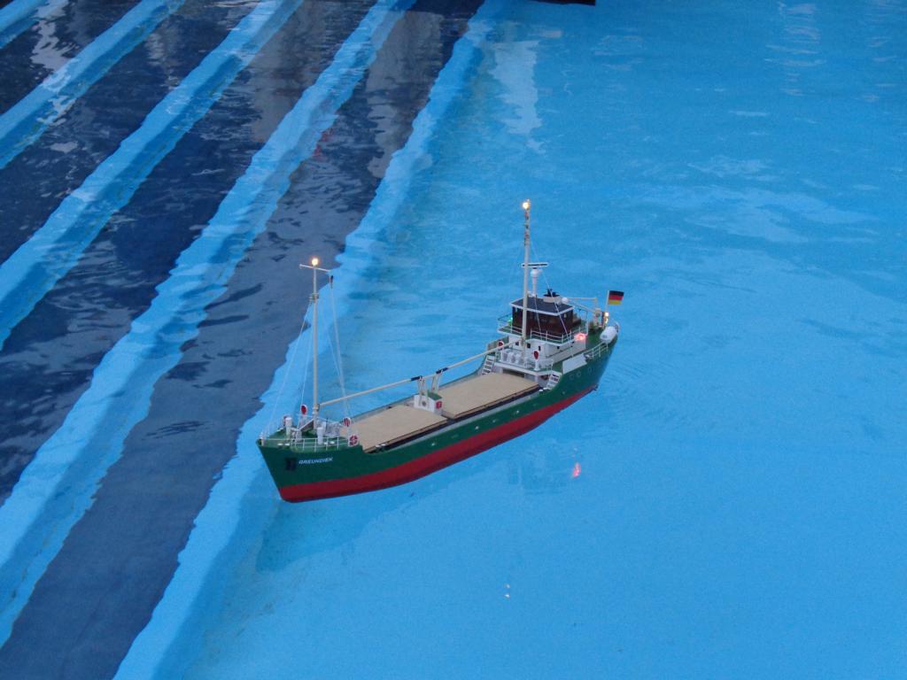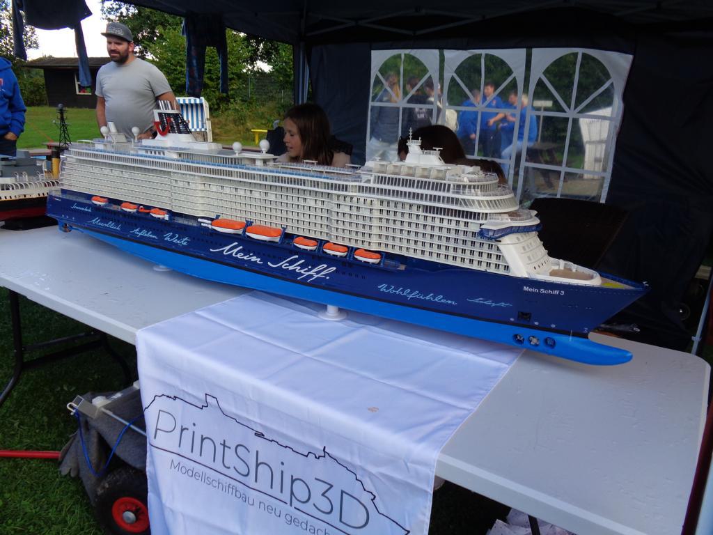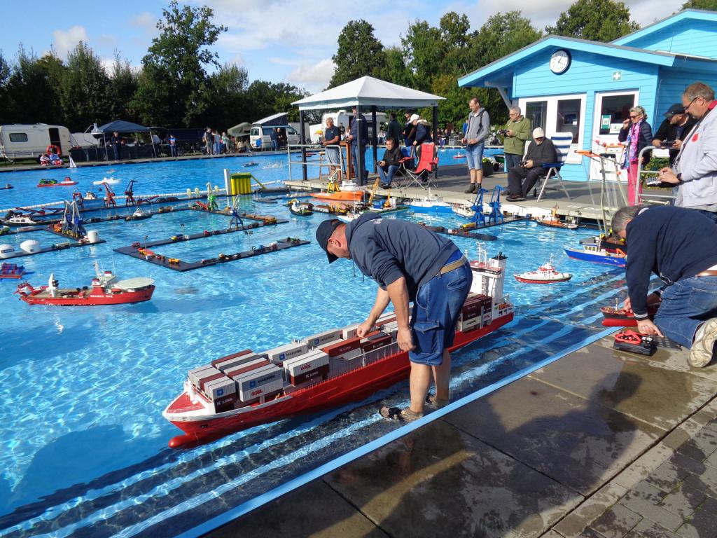 Besonders beeindruckend war ein Modell des Kreuzfahrtschiffs „Mein Schiff 3“ von TUI. Alle Teile sind auf dem 3D-Drucker entstanden und dann nachbearbeitet worden. Es gibt alleine über 1000 Sonnenliegen auf dem Modell zu entdecken. Auch das Modell des Schwimmkran´s ENAK war beeindruckend, mit dem riesigen Kranausleger. Die Modellbauer aus Drochtersen hatten ein Containerschiff, mit 263cm Länge mitgebracht welches mit 150kg Ballast bestückt werden mußte, damit es tief genug im Wasser lag