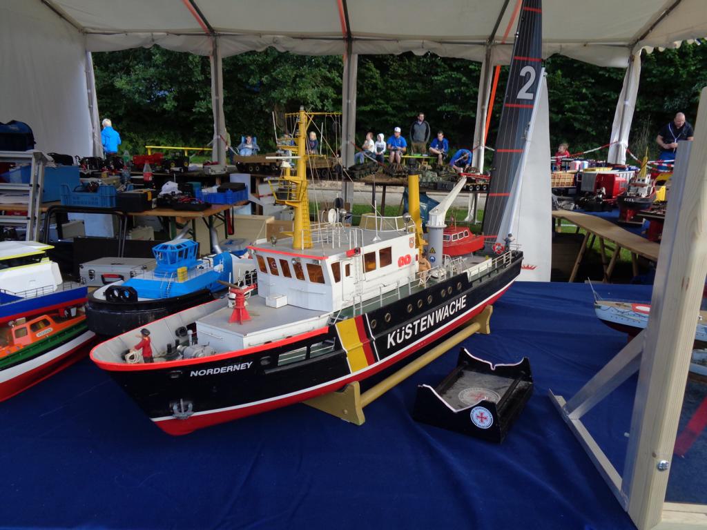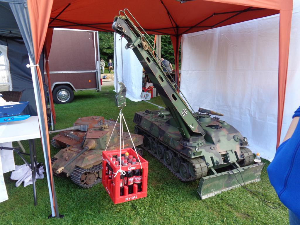 Einige Vereine hatten große Zeltpavillions aufgebaut unter denen ihre Modell wettergeschützt ausgestellt waren. Neben Schiffsmodellen gab es auch noch viele Autos, LKW´s, Baumaschinen und Panzermodelle zu bestaunen und in Aktion zu erleben. Die fuhren über das Gelände oder tobten sich in der Sandkiste aus. Für die Off-Road Abteilung gab es einen separaten Hindernis-Parcour zu bewältigen. Das große Modell eines Bergepanzers wog 390kg!!!!